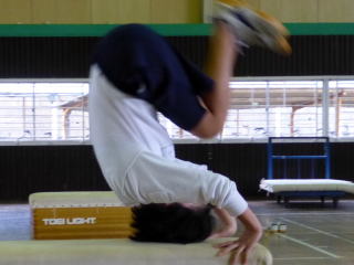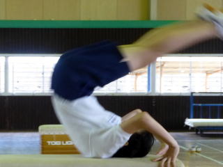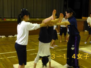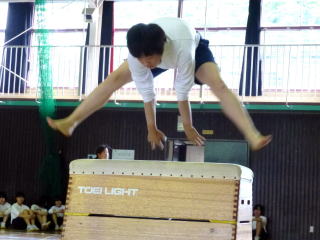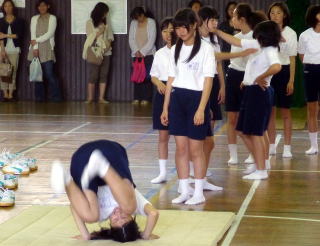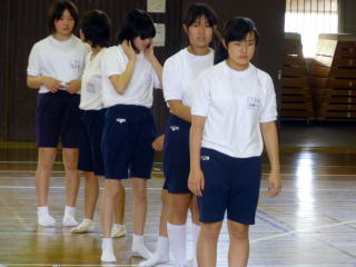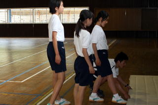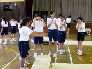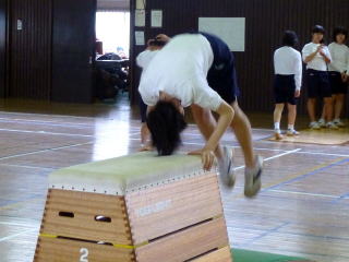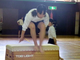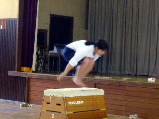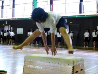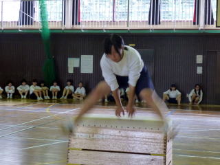 | 2年生女子の体育では跳び箱運動の発表会(テスト)を行っていました。5〜7段を開脚とぴ、閉脚とび、台上前転を能力別に分かれ、発表会を行っていました。どの生徒も、進歩の跡が見られる素晴らしい発表会でした。 |