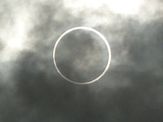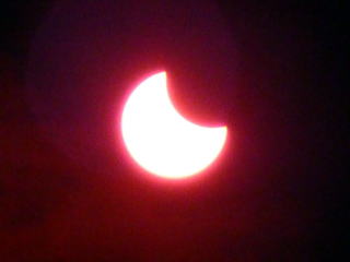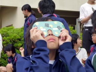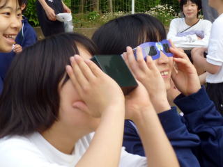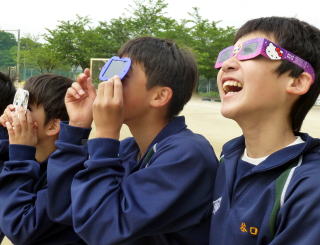 ![]() ![]() ![]() ![]() ![]() ![]() ![]() ![]() ![]() ![]() 四中での観測会は午前7時15分ごろからスタート。理科の先生方の手作りの観察キットや家庭から持参してきた観測用メガネを片手に、徐々に太陽が欠けていく様子を目にした生徒達からは「きれい」「すごい、すごい」と驚きの声があがりました。しかし、しだいに雲が厚くなり始めましたが、午前7時35分ごろには、鎌ケ谷でも雲の切れ間から太陽がリング状となった金環日食が観察できました。 |