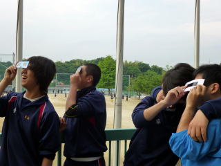 | 金環日食に対する対応について いま大きな話題の一つとなっている、5月21日(月)の金環日食ですが、色々と検討した結果、以下のように対応したいと思います。 1、通常通りの日課とする。 2、朝の部活動は、7時20分から40分の間休止し、全員グランドにて観察を行う。 3、観察に関しては、直接太陽を見ることは絶対禁止とし、次のどれかで観察させる。 @日食観察用のグラス(各自持参)で観察する。 A厚紙にピンホールを開けたもの(学校で準備します)で白紙に写して観察する。 B手鏡(各自持参又は学校で10枚程度準備)で白壁に写して観察する ※学校で準備するものは、Aの厚紙(@とBでの観察ができない生徒全員 分)とBの手鏡(10枚)です。それ以外に関しては、各自で準備して下さ い。 観察上の禁止事項 (HP c 2011 National Astronomical Observatory of Japanより) 以下のようなことは、目を痛めますので絶対にやってはいけません。
