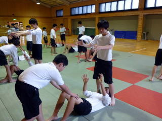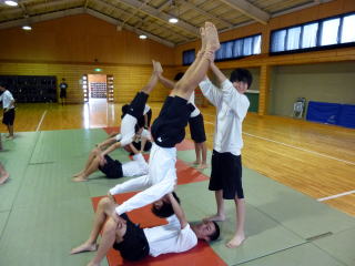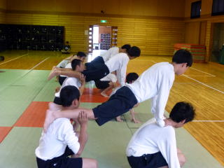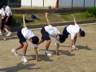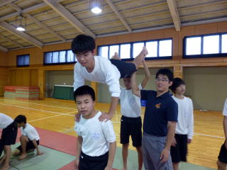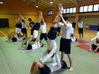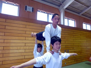 | 6月9日(土)に行われる体育祭での組体操の練習を行っています。3人組まで完成しました。これから、高度な演技に向かって進めていきます。女子のダンス練習は実行委員を中心に来週から始めます。 |